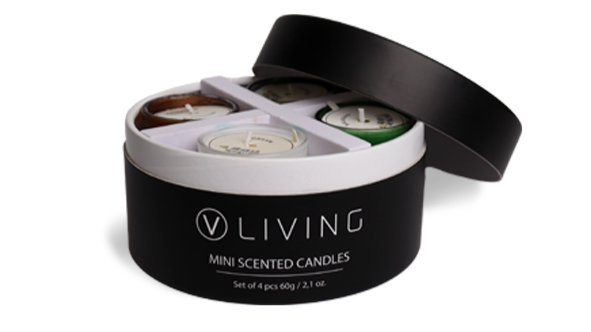 Ensemble Exclusif comprenant  4 mini-bougies artisanales de sojawas, enriches des parfums uniques de Vegas Cosmetics.