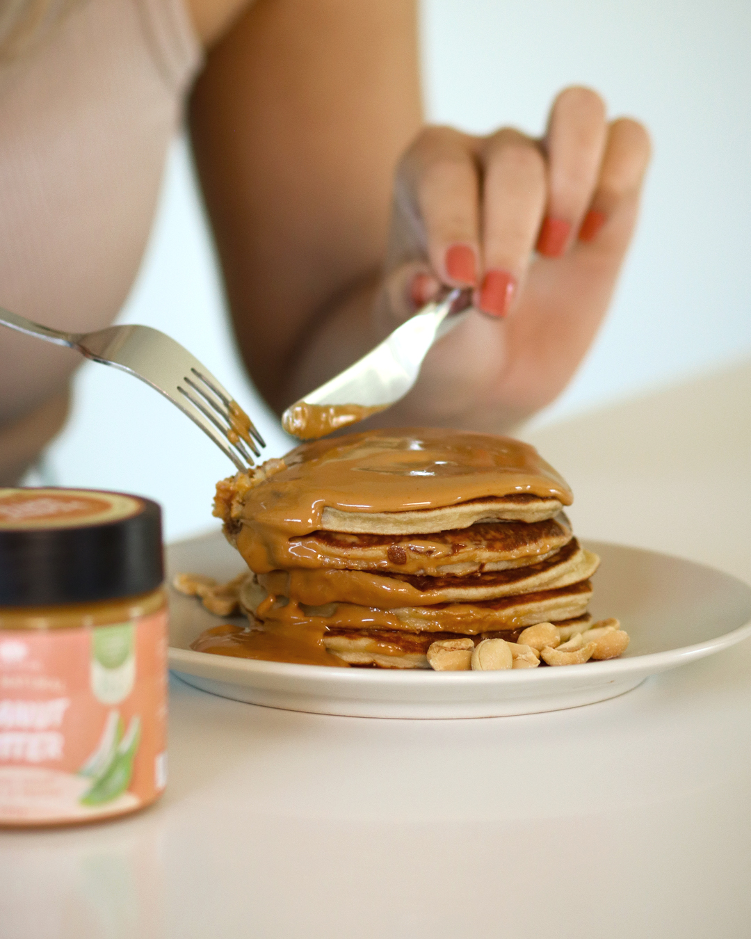 • Servez les pancakes avec la garniture au beurre de cacahuète et décorez avec vos fruits préférés et quelques fruits secs.